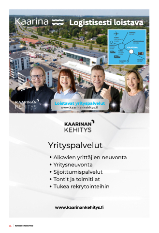 Logistisesti loistava Loistavat yrityspalvelut www.kaarinankehitys.fi Yrityspalvelut Alkavien yrittäjien neuvonta Yritysneuvonta Sijoittumispalvelut Tontit ja toimitilat Tukea rekrytointeihin www.kaarinankehitys.fi 16 Krossin Syyssiivous